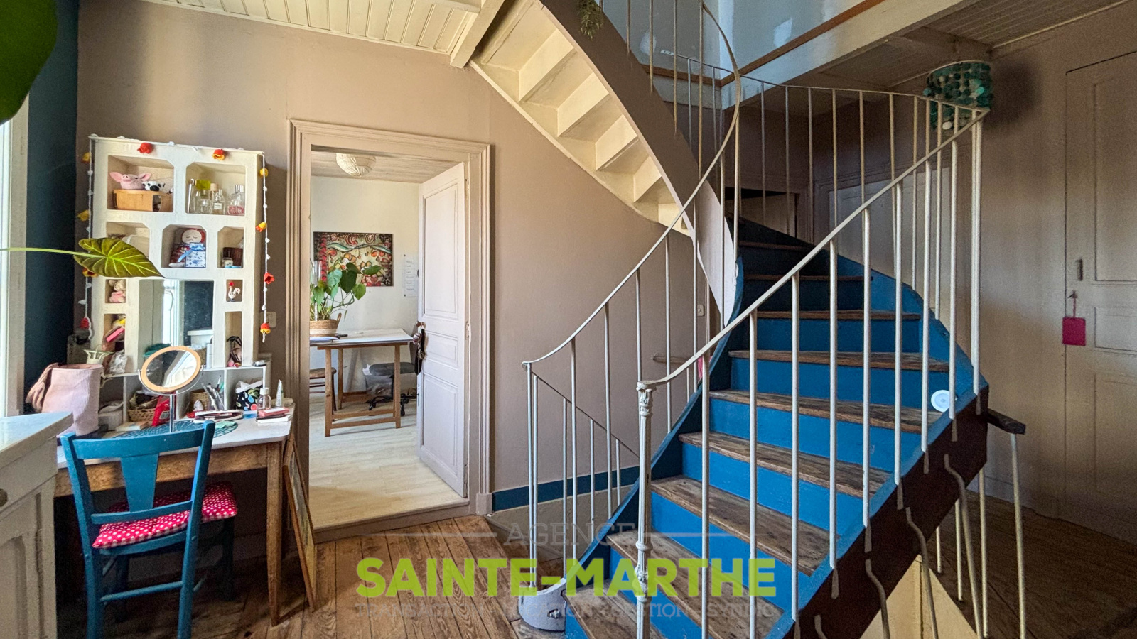 1er étage : palier desservant deux chambres avec placards, un bureau, ainsi qu’une salle de bains avec WC.