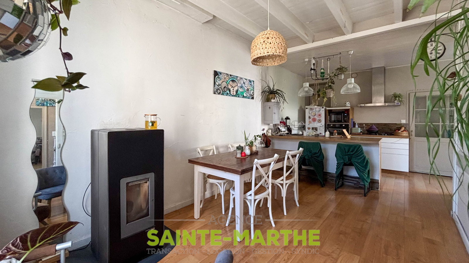 Rez-de-chaussée : hall d’entrée, salon, cuisine ouverte sur la salle à manger avec poêle à granulés (installé en 2020).